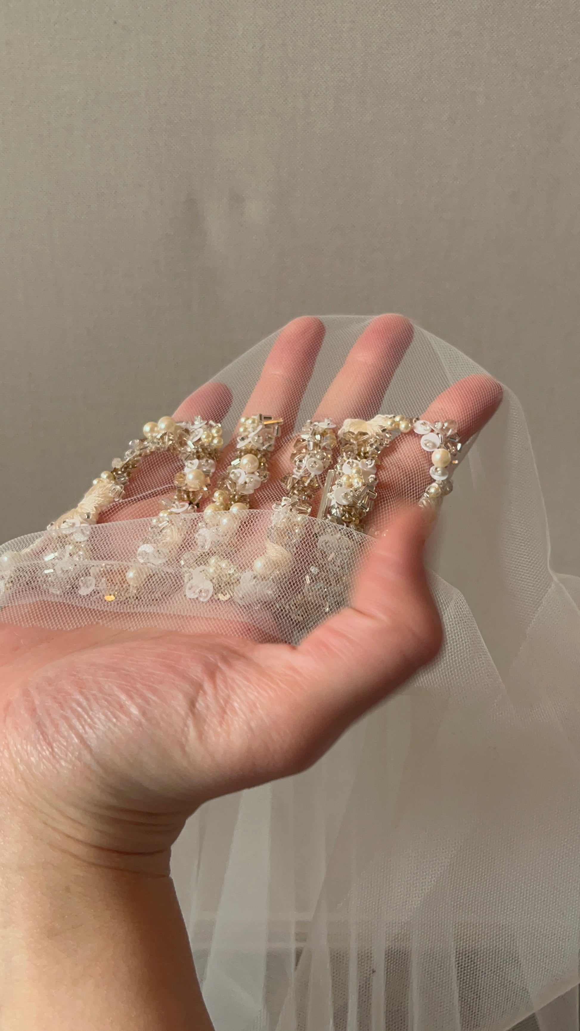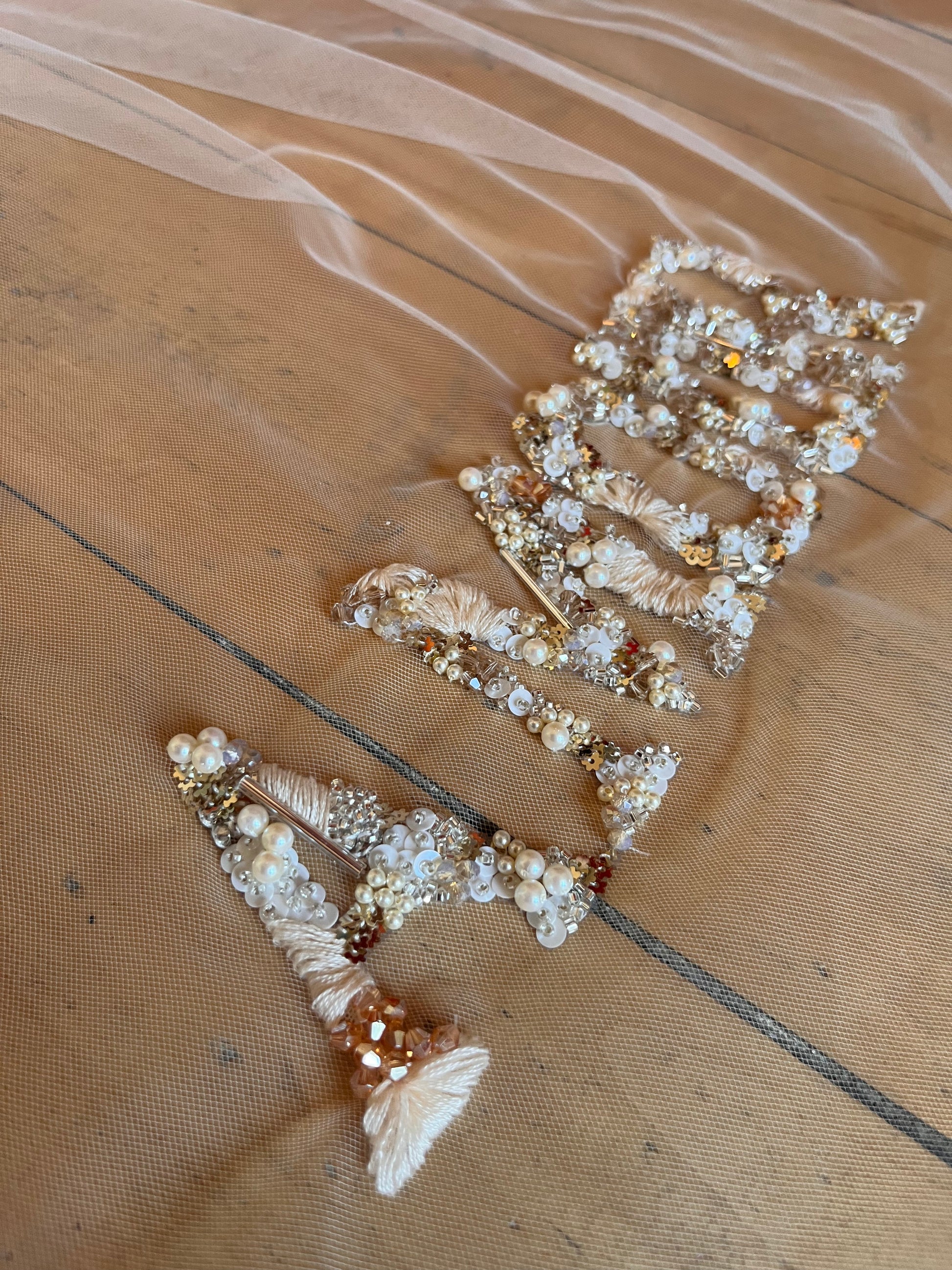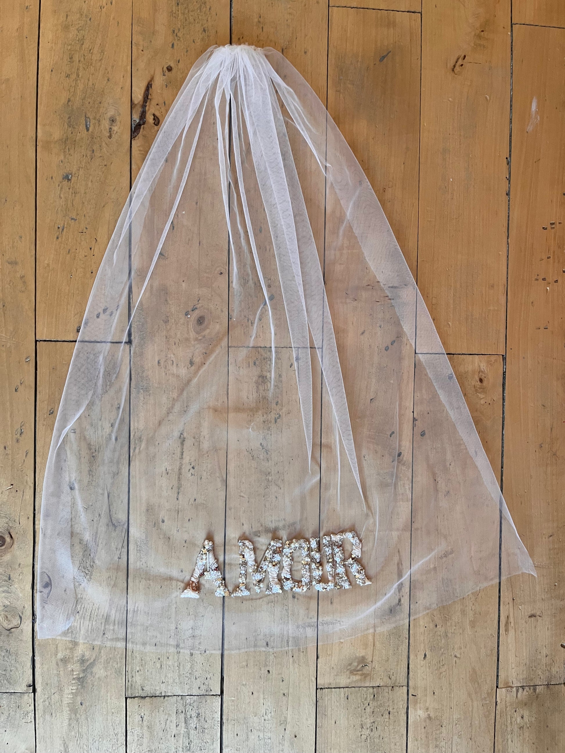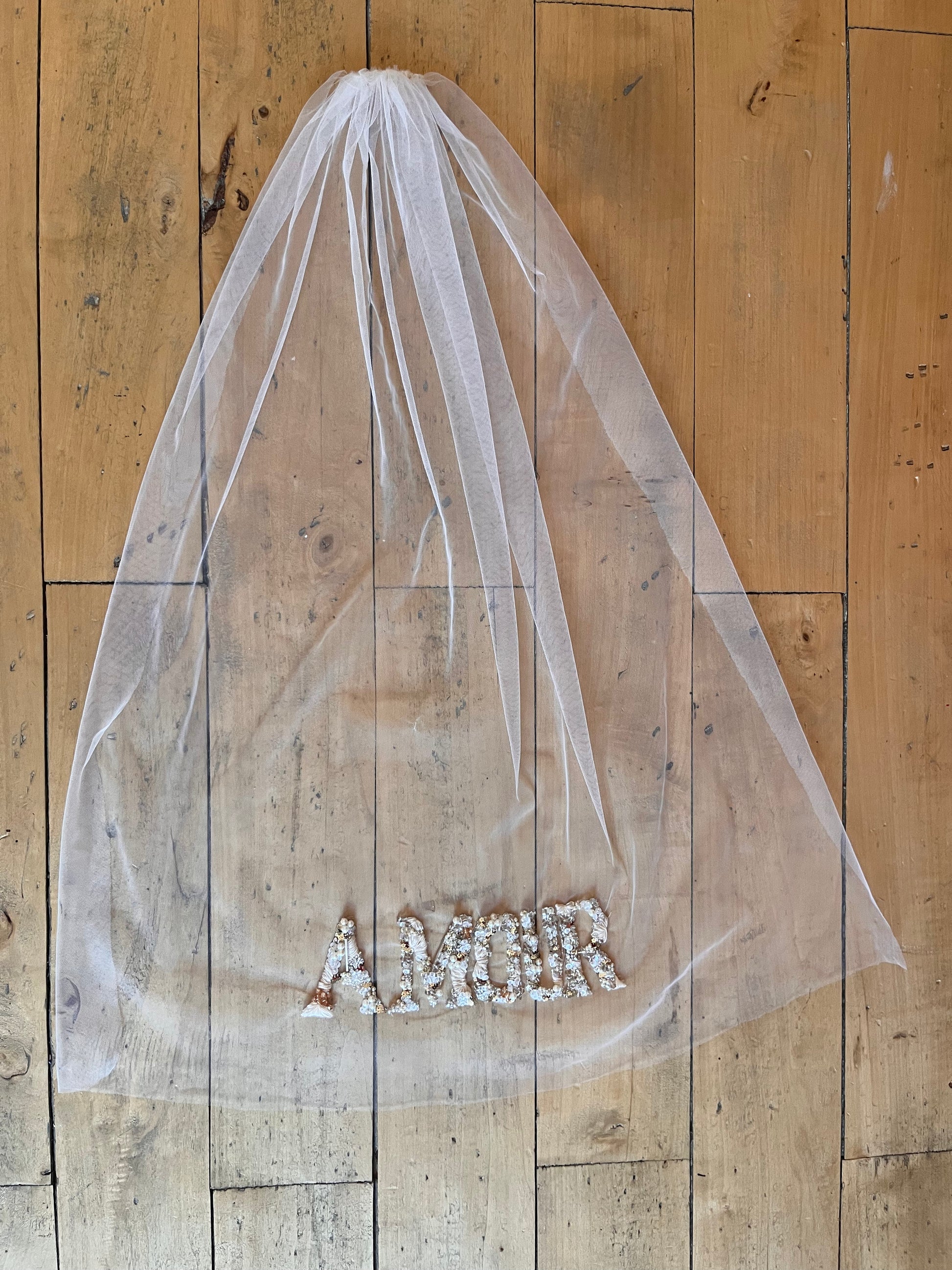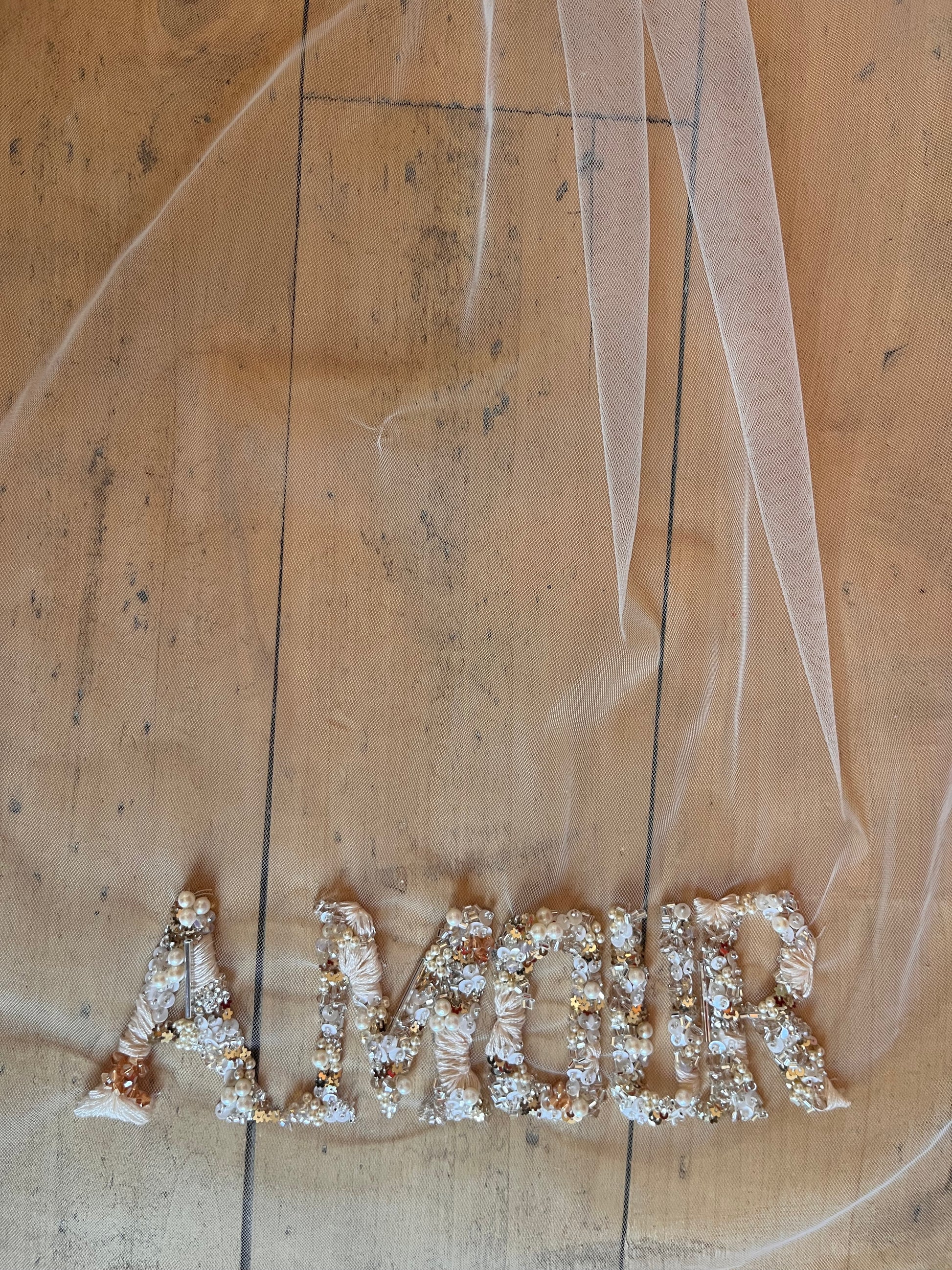 Voile de mariée court monté sur peigne, orné d'une broderie délicate du mot « Amour » réalisée en mélange de matières. Cette création allie tradition et modernité, avec des fils et perles travaillés en harmonie pour créer une texture raffinée et lumineuse. Le peigne discret assure une tenue sécurisée tout en préservant l'élégance de votre coiffure. Une pièce intemporelle qui exprime vos sentiments les plus profonds le jour de votre mariage.
