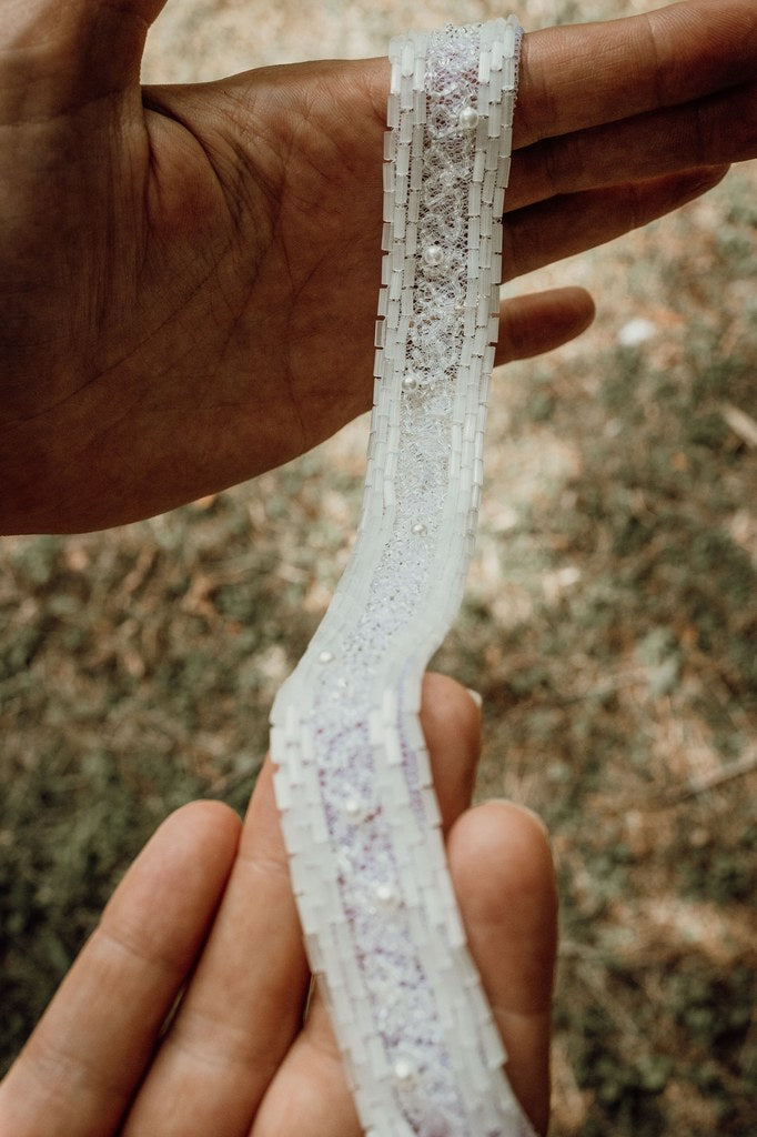 Galon bordé de tubes brodé en trois ligne de chaque côté, de petites perles cristal de boule 3mm, et de petites toupies cristal.