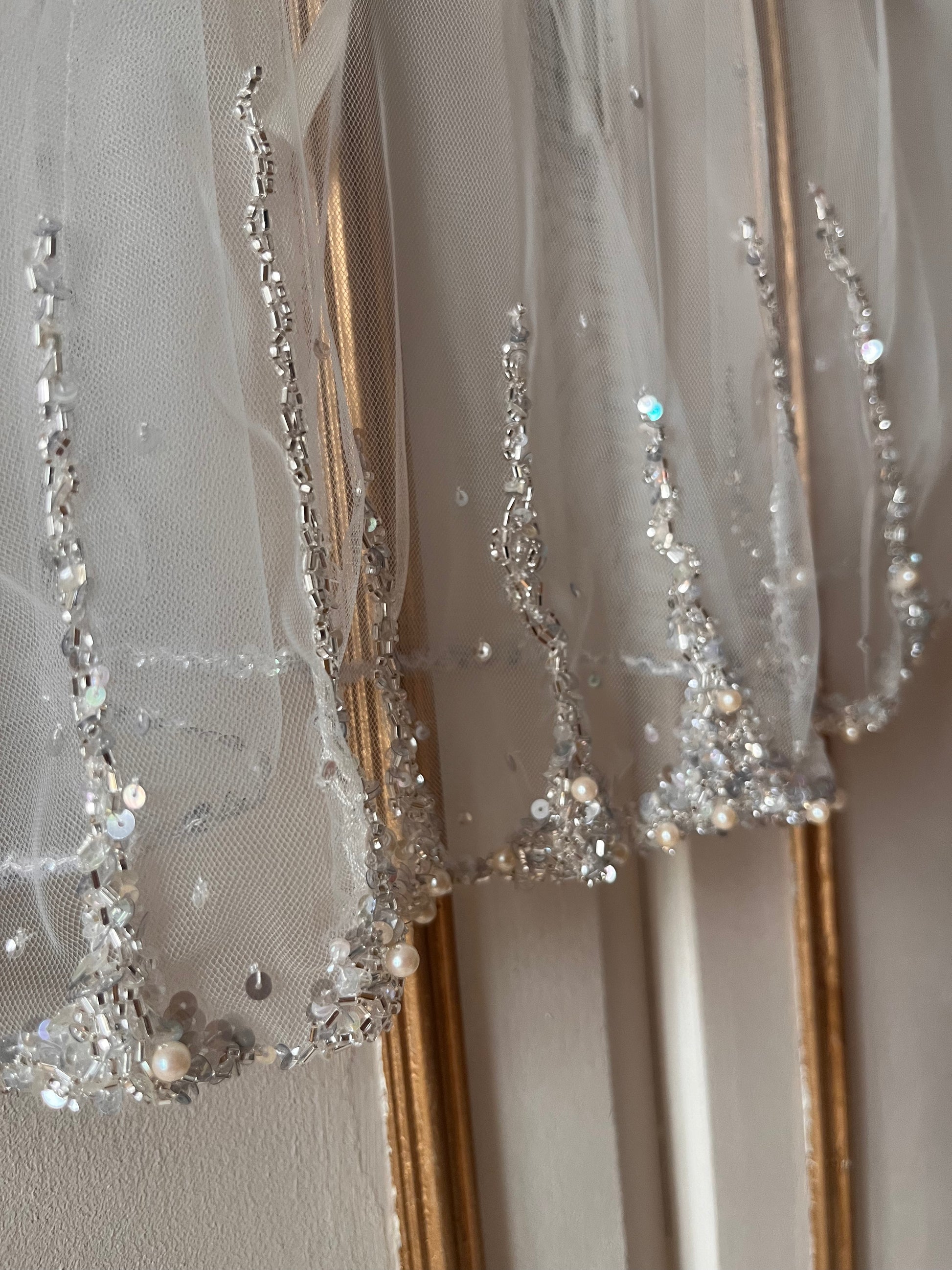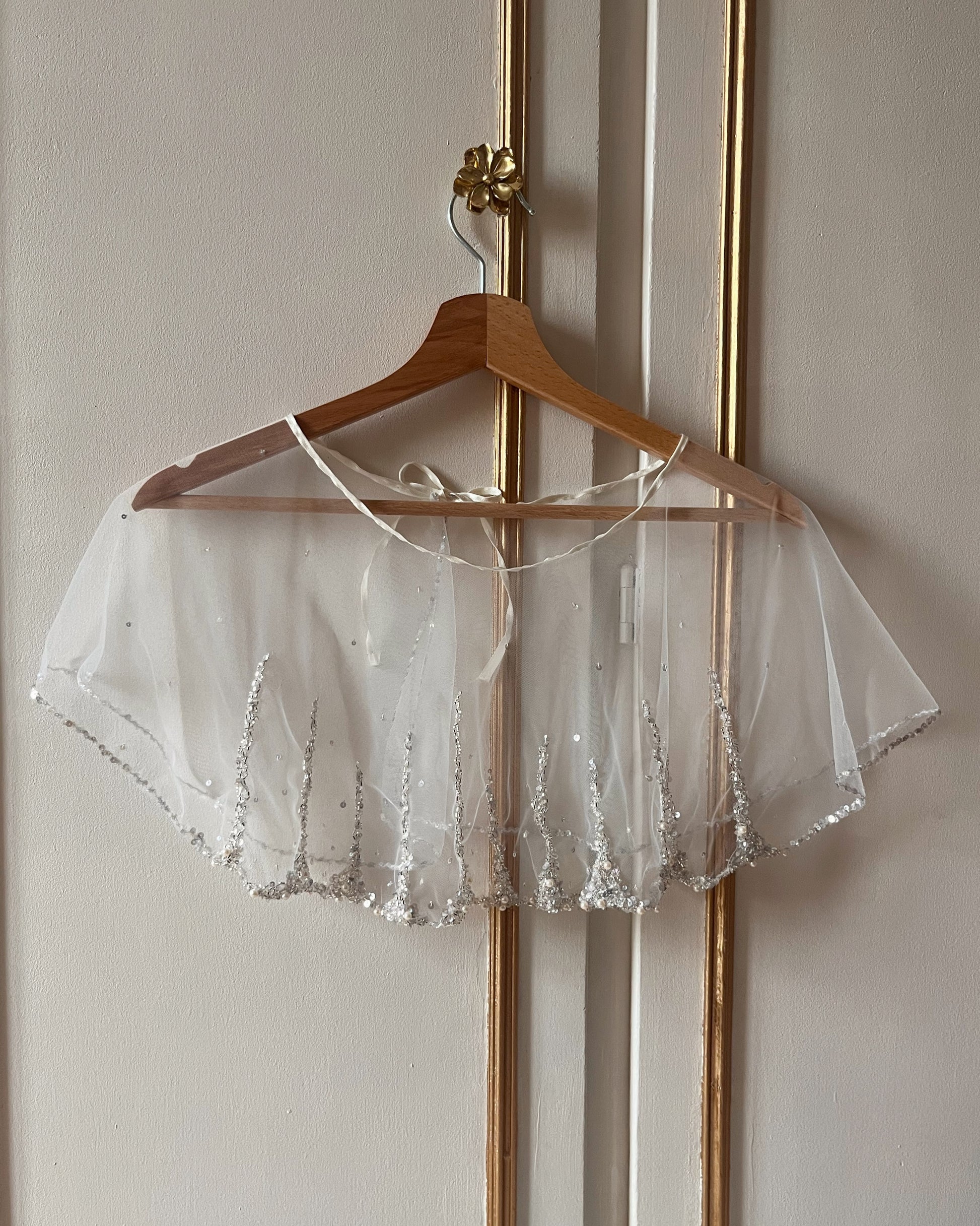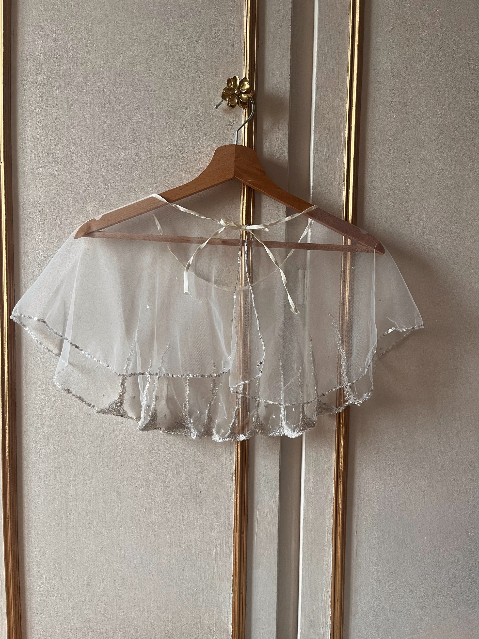 Voile en tulle aérien orné d'une broderie grimpante délicate associant perles et paillettes. La bordure de paillettes scintillantes souligne l'encolure, complétée par un ruban de satin qui apporte une finition raffinée et élégante. Pièce incontournable pour sublimer vos créations avec une touche de sophistication lumineuse.