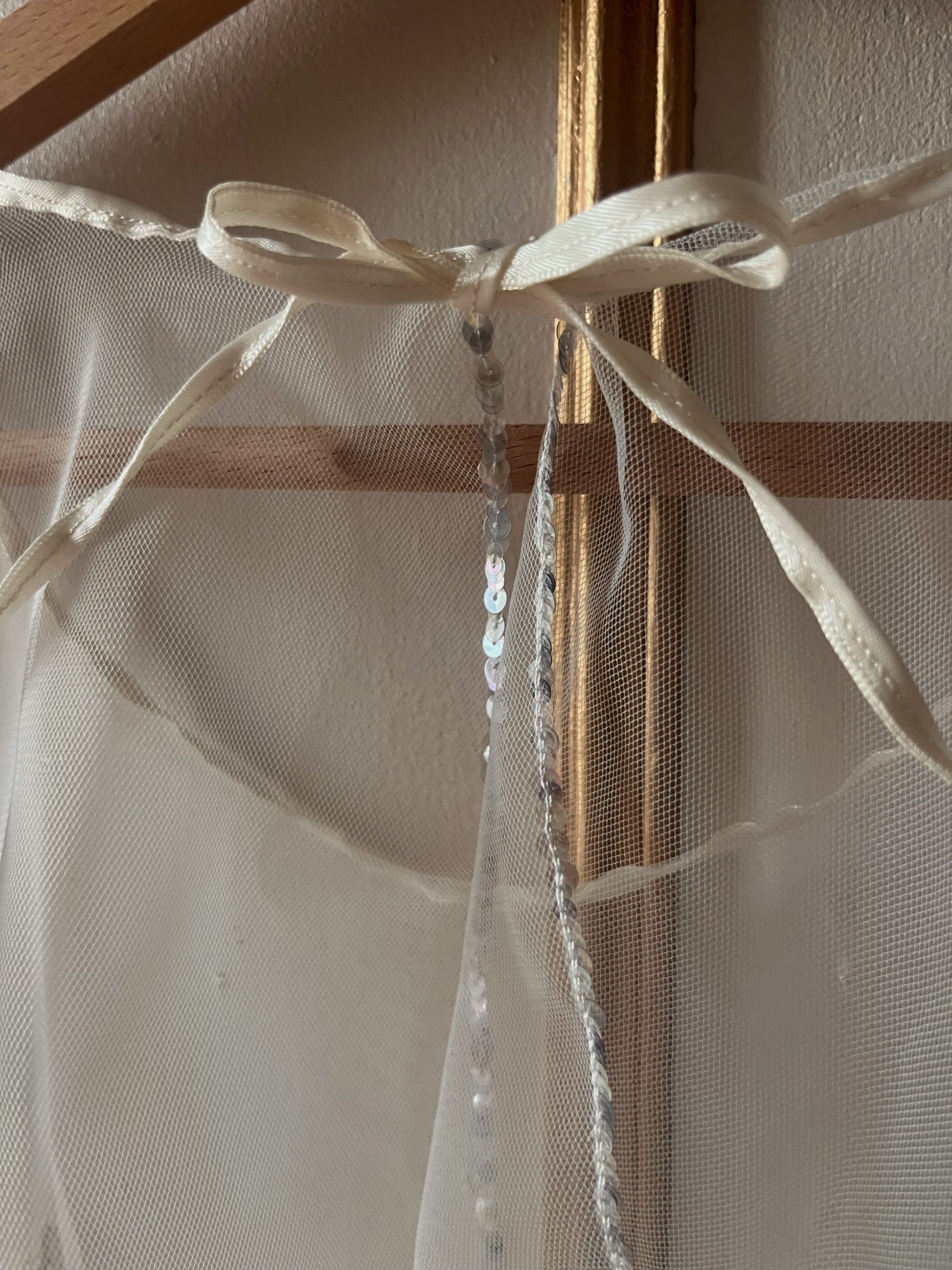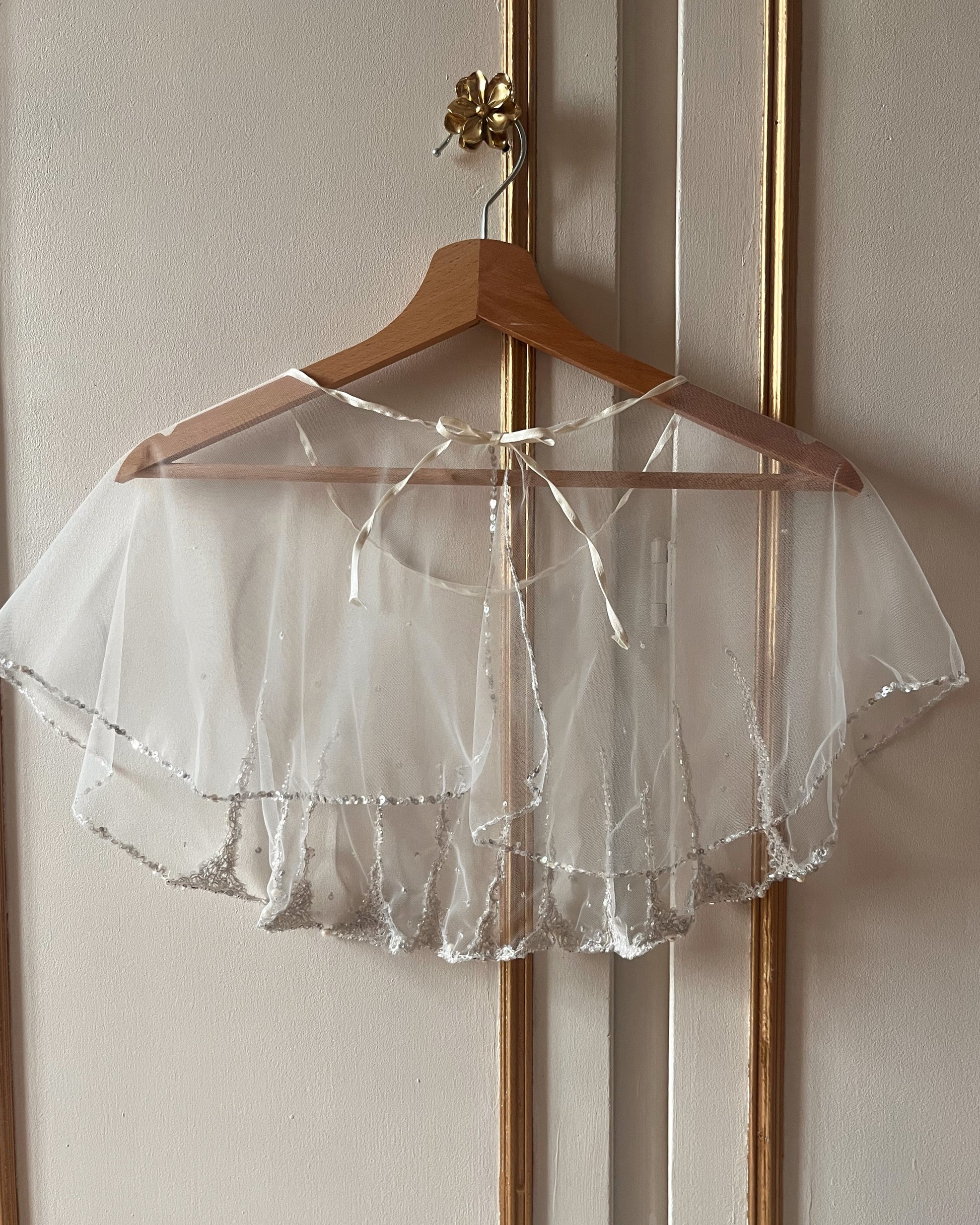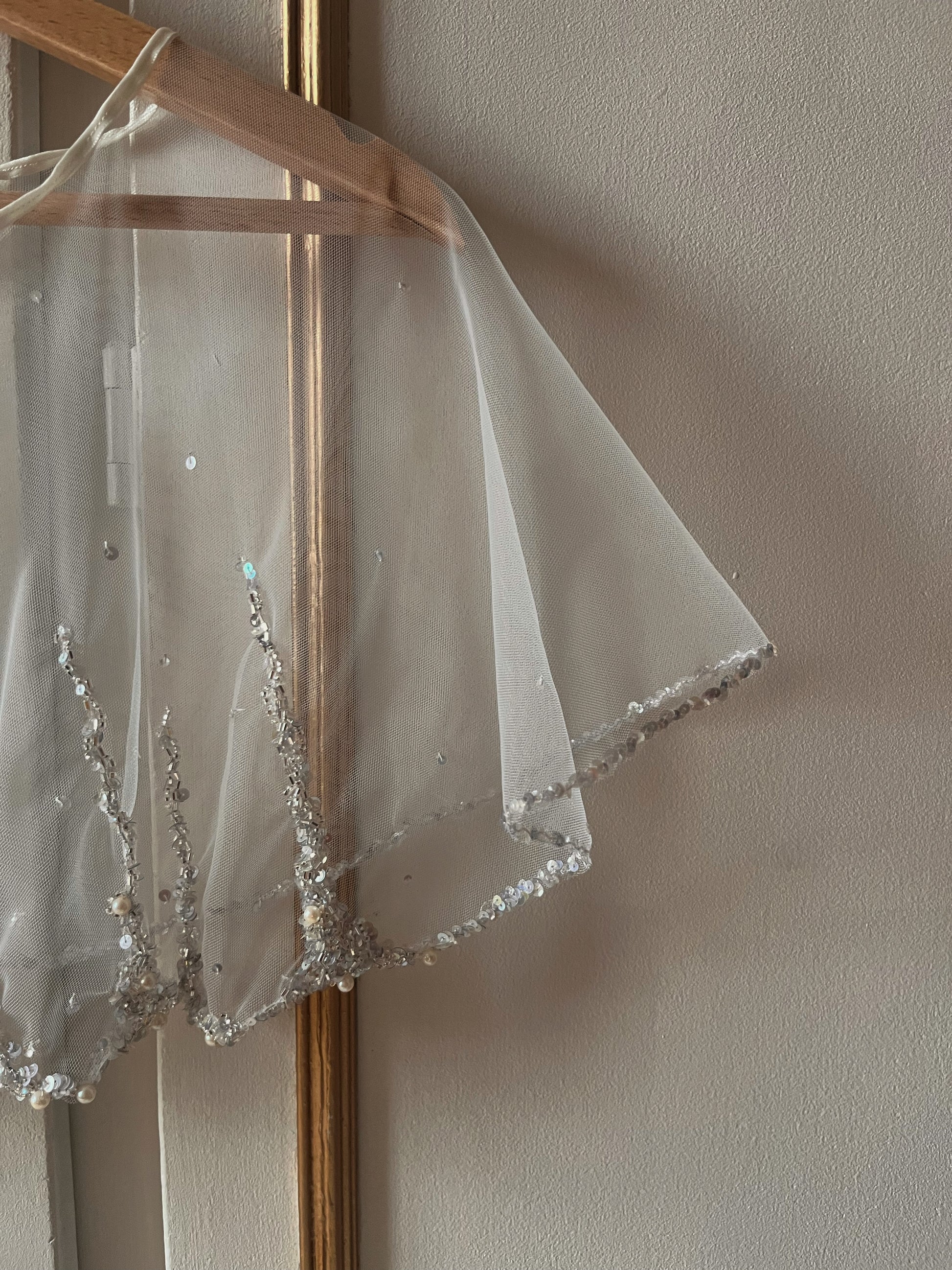Voile en tulle aérien orné d'une broderie grimpante délicate associant perles et paillettes. La bordure de paillettes scintillantes souligne l'encolure, complétée par un ruban de satin qui apporte une finition raffinée et élégante. Pièce incontournable pour sublimer vos créations avec une touche de sophistication lumineuse.