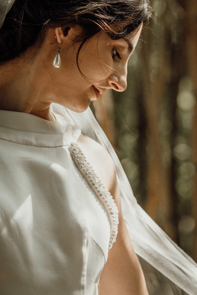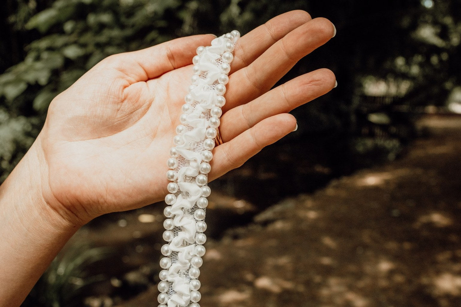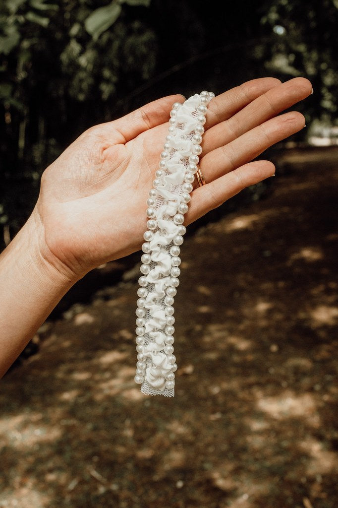 Galon brodé de perles de 6mm, de toupies cristal et de tissus ivoire sur deux épaisseurs de tulles.