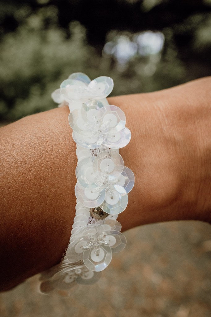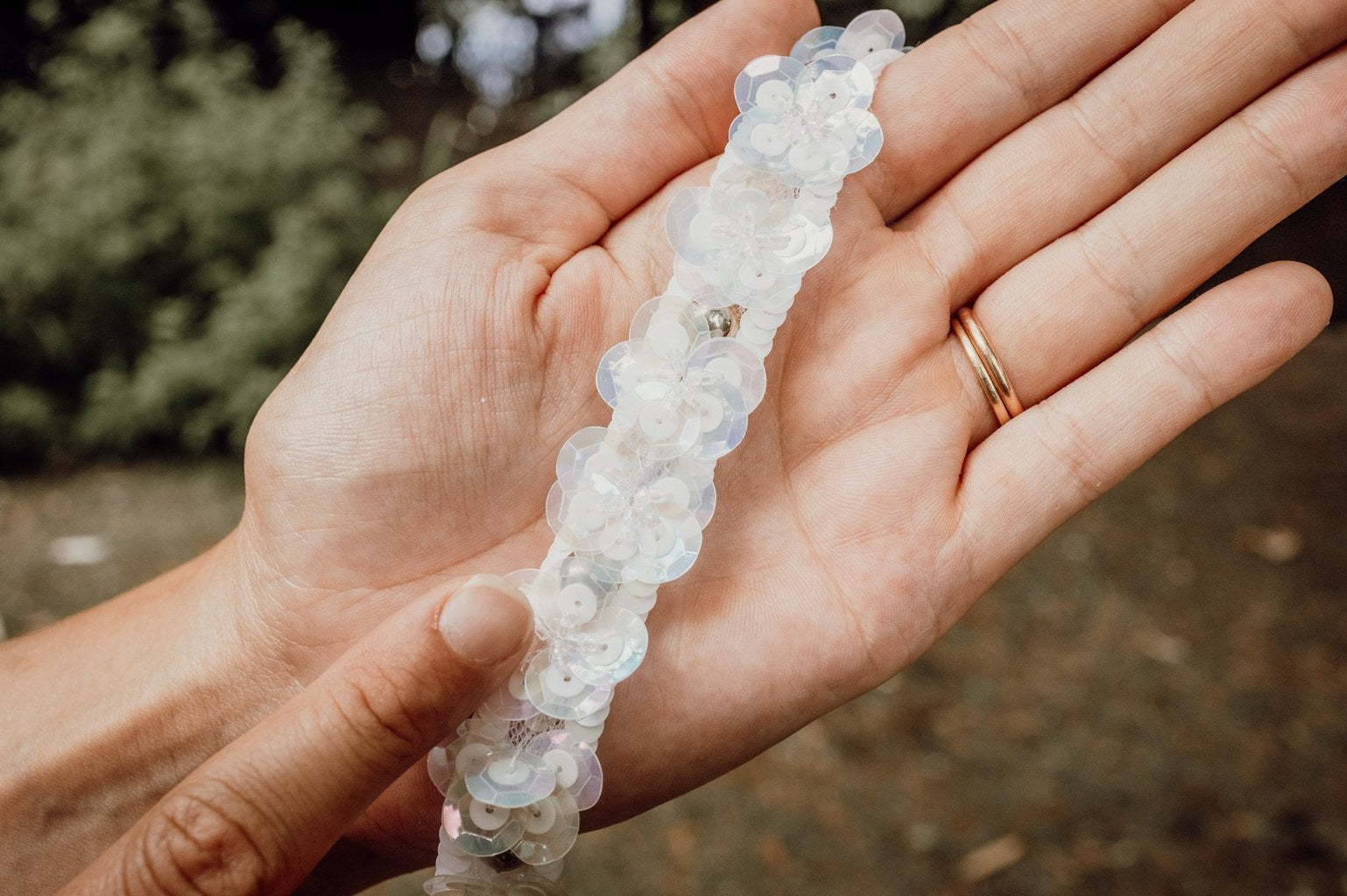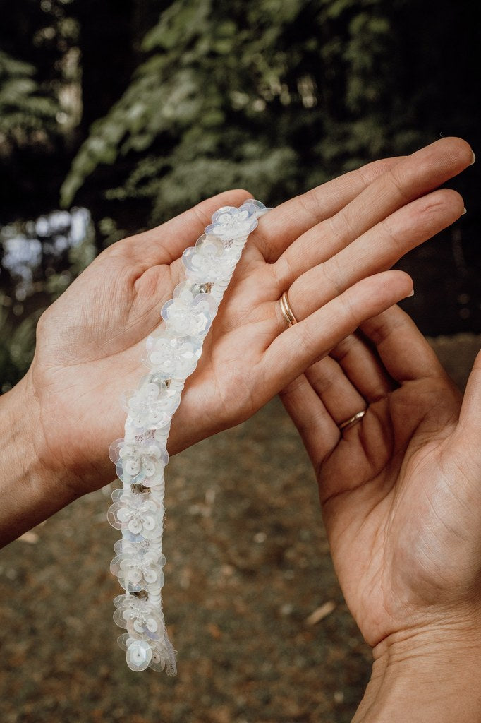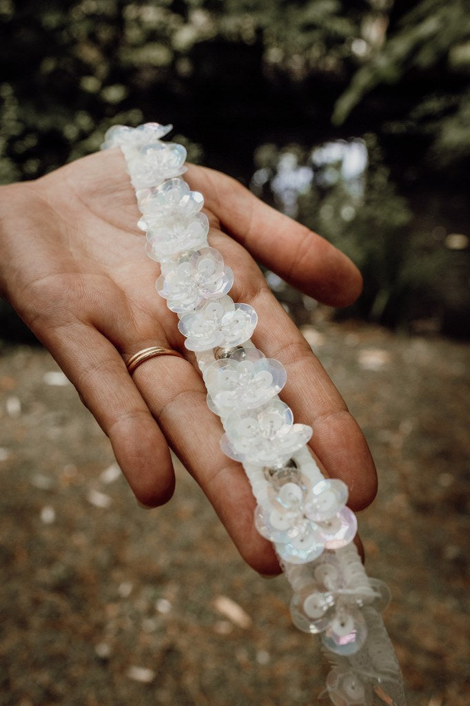 Galon brodé de paillettes ivoire de chaque côté du galon, de toupies, de cabochons doré avec des fleurs faites avec des paillettes taille 10 des paillettes taille 5 et de perles.