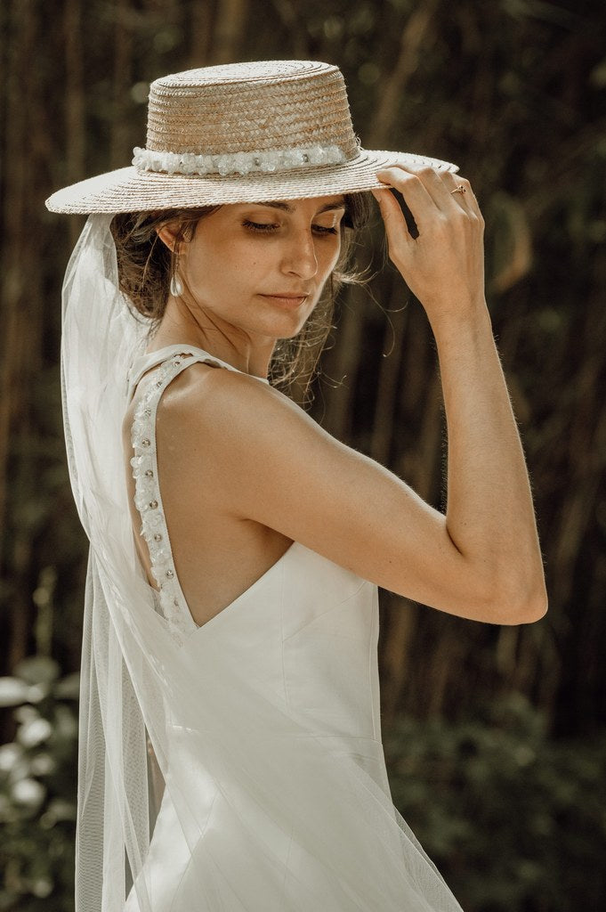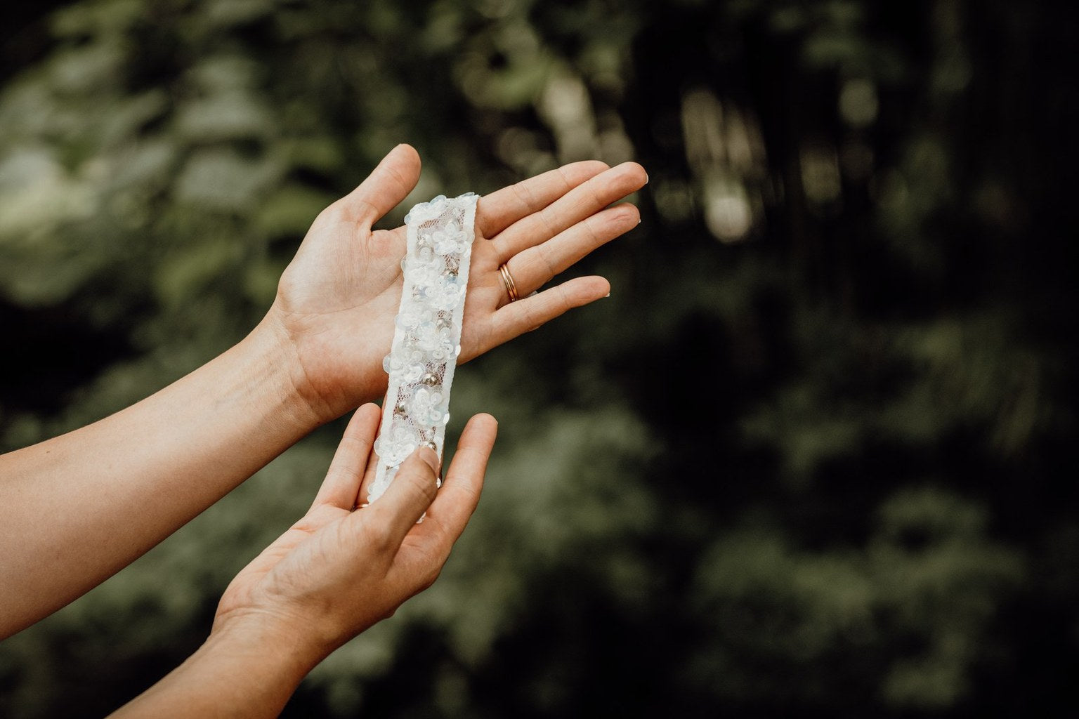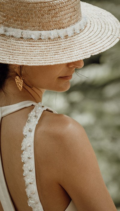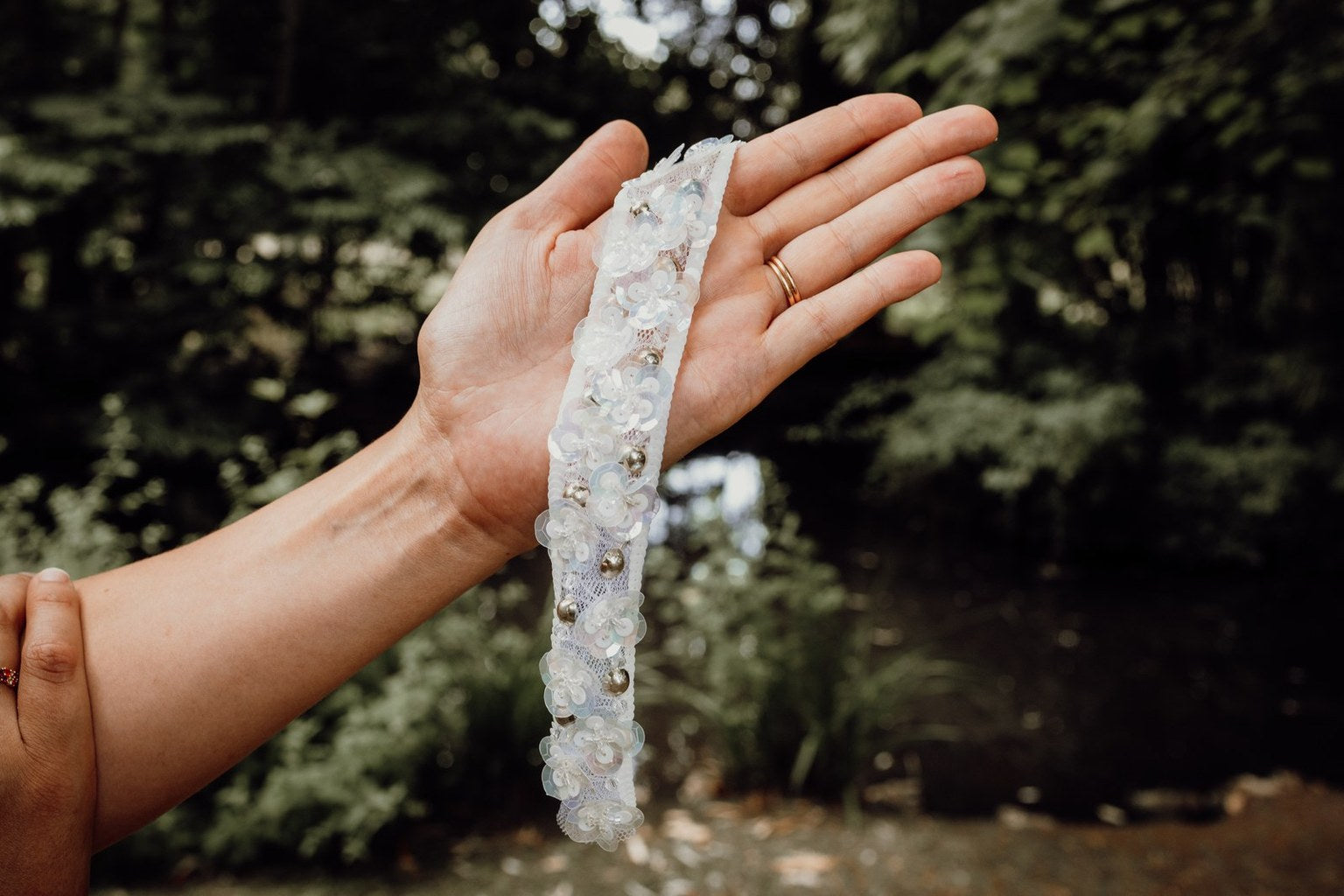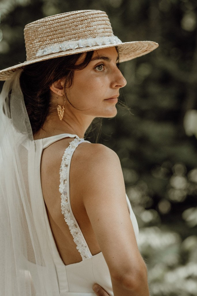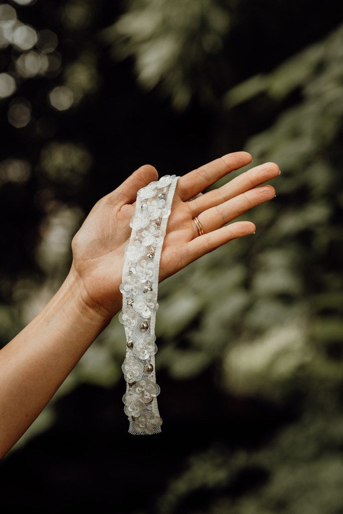 Galon brodé de paillettes ivoire de chaque côté du galon, de toupies, de cabochons doré avec des fleurs faites avec des paillettes taille 10 des paillettes taille 5 et de perles. Louise est la version plus large d'Irene.